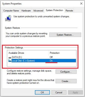 Kemudian buka Control Panel > System > System Protection dan perhatikan bagian Protection Setting yang akan menunjukkan apakah system restore point aktif atau tidak. Jika aktif, instruksi diaktifkan, jika tidak, instruksi dinonaktifkan.Caranya klik pada drive C > klik Configure.